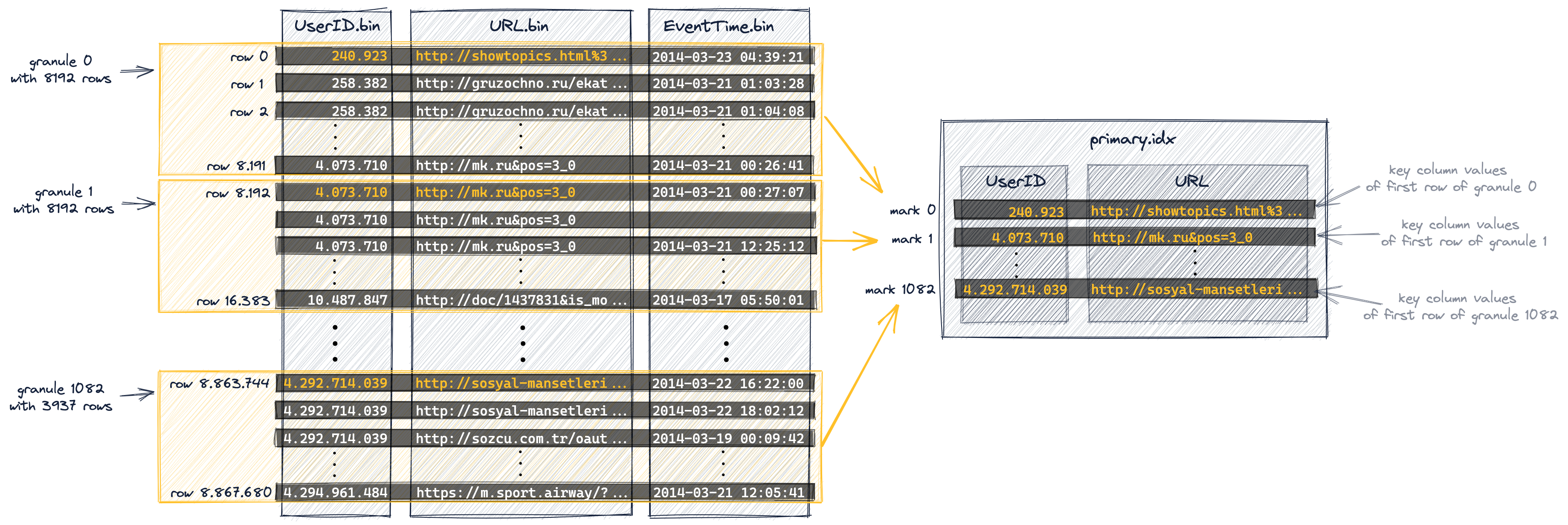 • We marked some column values from our primary key columns (UserID, URL) in orange. These orange-marked column values are the primary key column values of each first row of each granule. As we will see below, these orange-marked column values will be the entries in the table's primary index.