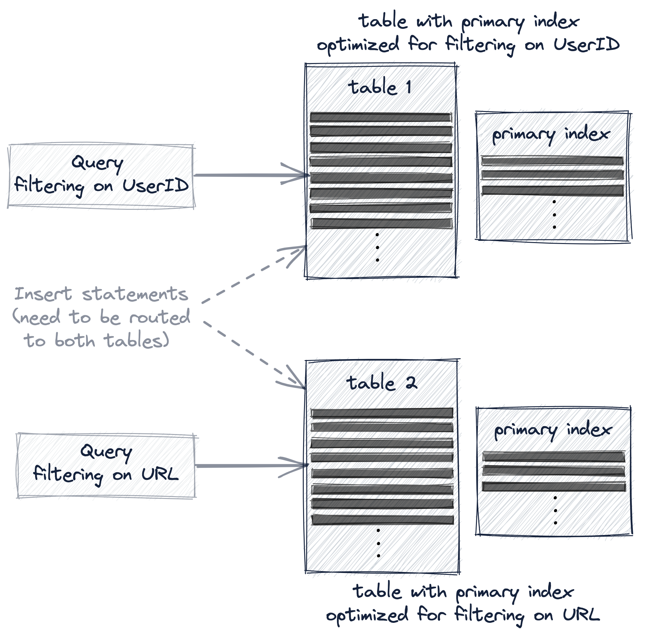 We now have two tables. Optimized for speeding up queries filtering on UserIDs, and speeding up queries filtering on URLs, respectively: