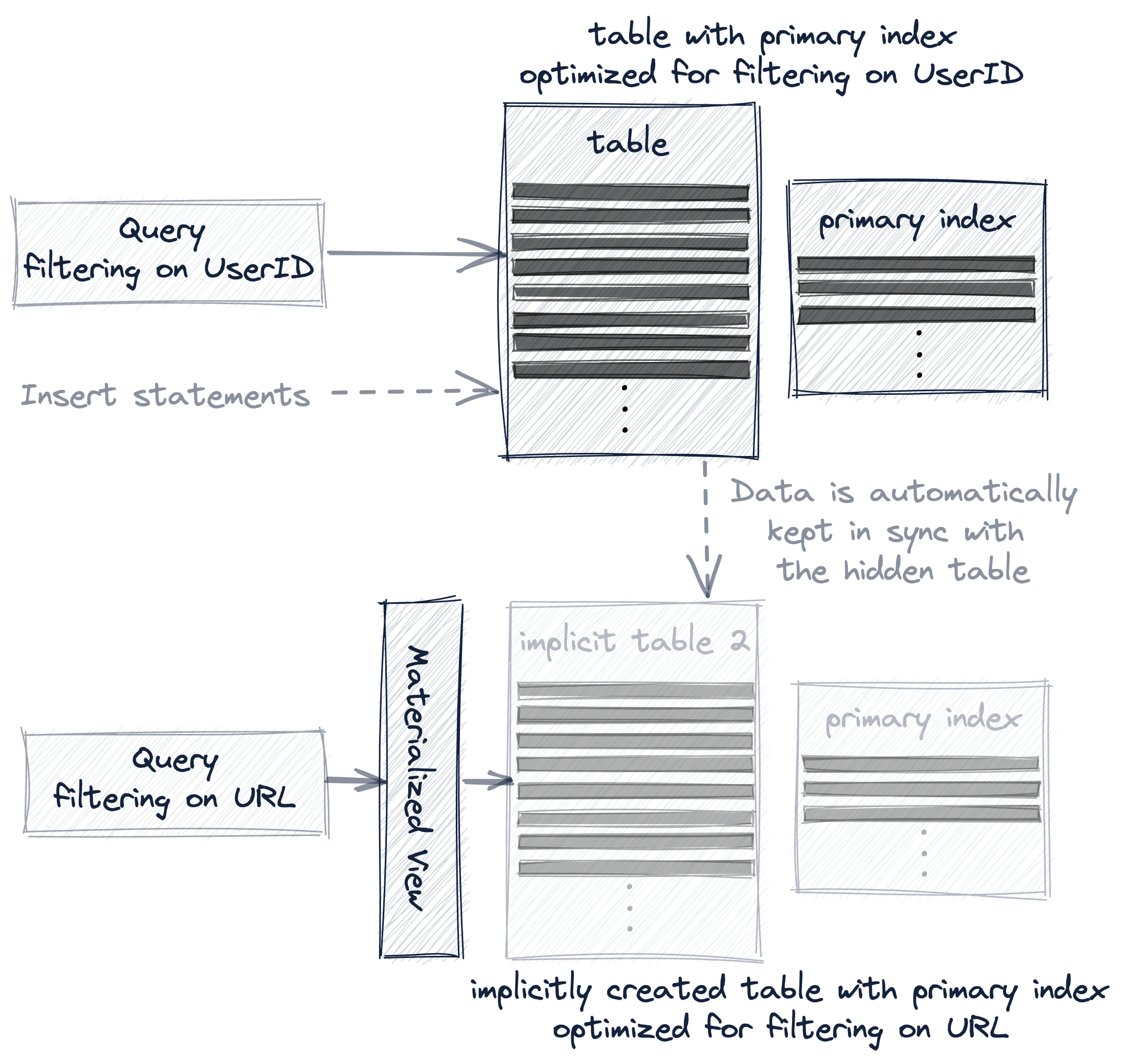 • a query is always (syntactically) targeting the source table hits_UserID_URL, but if the row order and primary index of the hidden table allows a more effective query execution, then that hidden table will be used instead