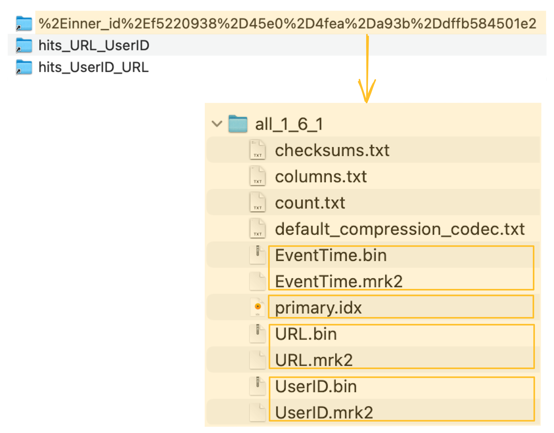 ClickHouse is storing the column data files (.bin), the mark files (.mrk2) and the primary index (primary.idx) of the hidden table in a special folder (marked in orange in the screenshot below) next to the source table's data files, mark files, and primary index files:
