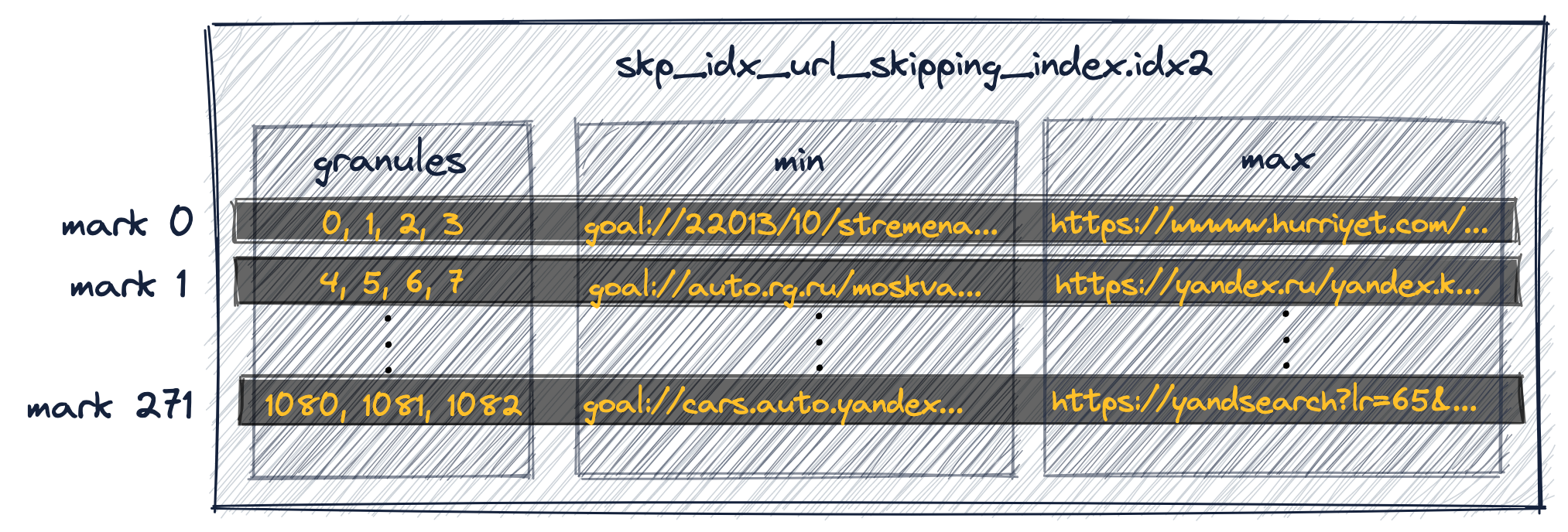 • the second index entry (‘mark 1’ in the diagram below) is storing the key column values of the first row of granule 1 from the diagram above, and so on.