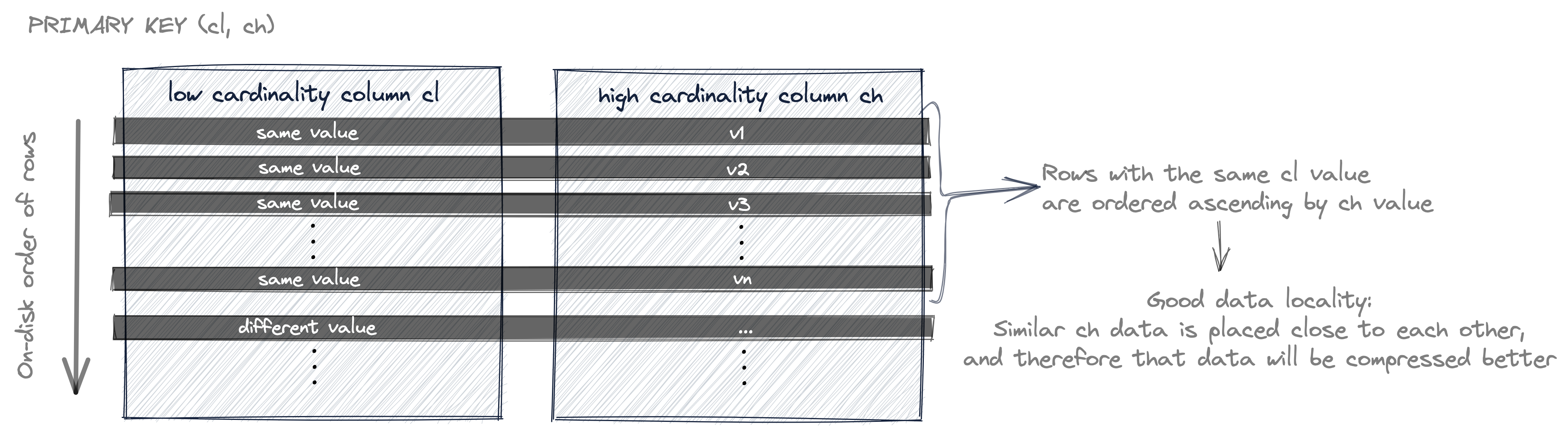 In the diagram above, the table's rows (their column values on disk) are first ordered by their cl value, and rows that have the same cl value are ordered by their ch value. And because the first key column cl has low cardinality, it is likely that there are rows with the same cl value. And because of that it is also likely that ch values are ordered (locally - for rows with the same cl value).