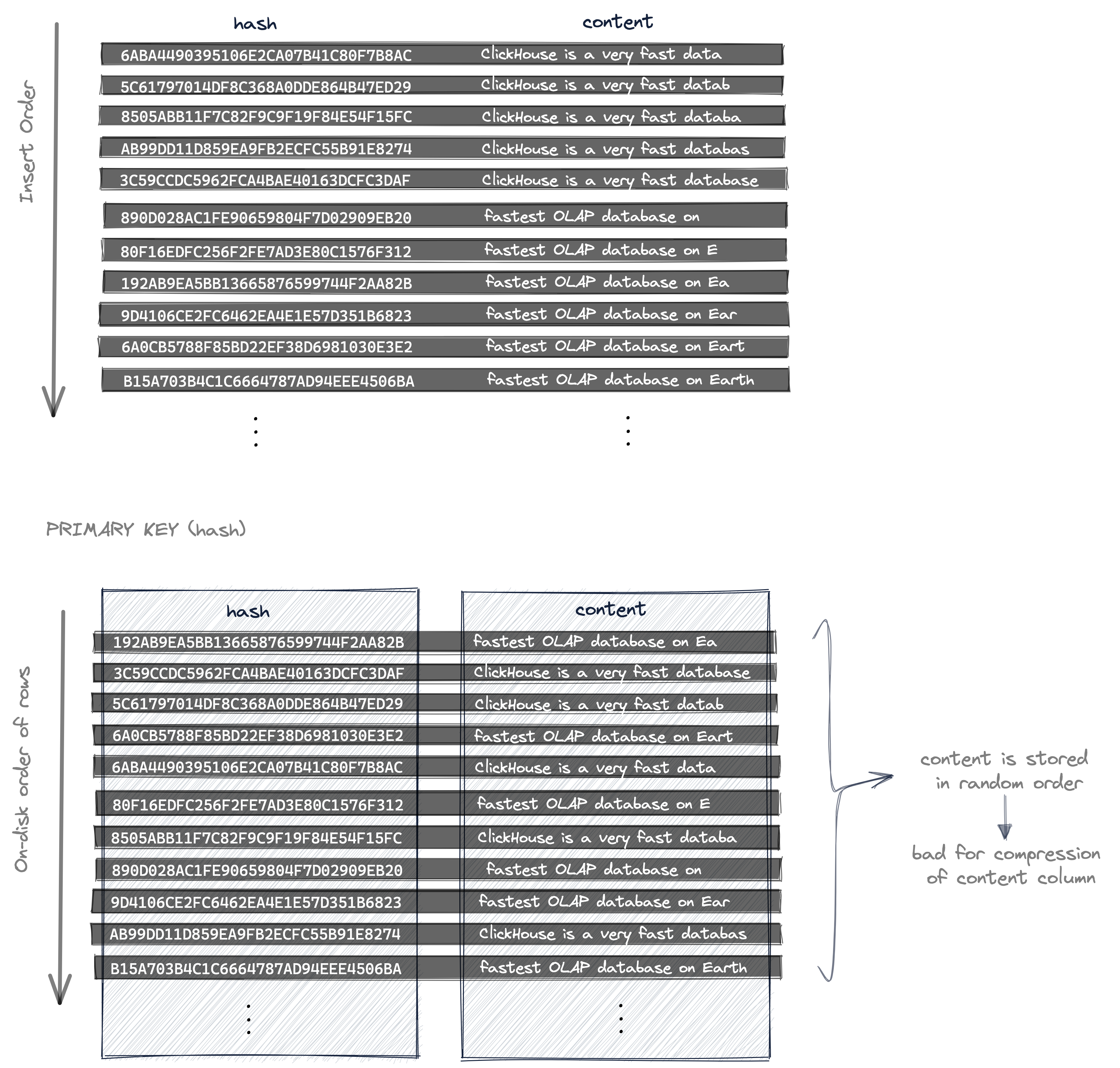 • the table's rows (their column data) are stored on disk ordered ascending by (the unique and random) hash values. Therefore also the content column's values are stored in random order with no data locality resulting in a suboptimal compression ratio for the content column data file.